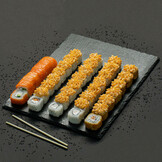 1.Лава темпура с лососем 8шт, (лосось, сыр, соус лава, темпура сухари панко). 2.Кани темпура 8шт(снежный краб, сыр, огурец,темпура, сухари панко).3.Темпурный с курицей . ( курица терияки, сыр огурец, лук зеленый,темпура, сухари панко, соус спайси , соус унаги). 4. Айёва с курицей 8шт. ( курица, сыр, огурец, темпура, сухари панко, соус айёва).