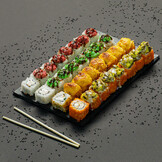 1.Филадельфия лайт 8шт,2.Ролл с креветкой и сыром 8шт,3.Ролл с крабовым муссом 8шт,4.Сяке маки 8шт, 5. Салмон спайси 8шт. 6.Чикен ФРЕШ 8шт.7.жаренный НАНЬЯН ролл 8шт.8.запеченный Инь-янь ролл 8шт.
