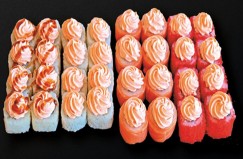 Лава де люкс, 8шт(лосось, сыр, соус лава),Киото 8шт (лосось, сыр, огурец, кунжут, унаги соус,)Бонито чикен (курица, сыр, огурец, стружка тунца, соус Ким чи) , Вулкан 8шт ( лосось, сыр, огурец, икра масаго, соус лава), Калифорния с креветкой 8шт ( креветка, майонез, огурец, икра масаго),Тортилья с курицей 8шт, ( курица, огурец ,помидор, лист салата,тортиья сырная). Каппа маки 8шт( огурец, ,кунжут), Филадельфия классическая 8шт(лосось, сыр).