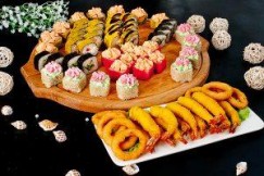 1.Амели ролл 8шт. (Лосось терияки, зеленый лук, помидор , омлет томаго, кунжут, соус Айева+соус ред запечен),2.Вулкан ролл 8шт. ( лосось, сыр, огурец, икра масаго, соус лава). 3.Каппа маки 8шт. (Огурец, сыр, нори). 4. Ролл сяке хотто 8шт. (Лосось лук зеленый сыр, огурец, соус кимчи, масаго, темпура, сухари панко). 5.Кани темпура 8шт. ( краб, сыр, огурец), 6. Лава темпура 8шт. (Лосось, сыр, соус лава, кляр, сухари панко). 7.Луковые кольца-100гр, 8.Креветки в темпуре-200гр.