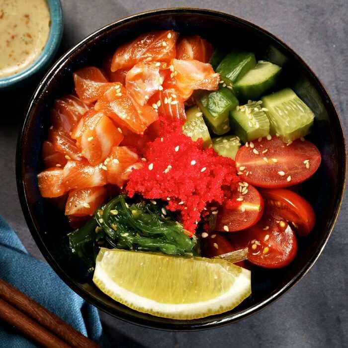 Поке с лососем 539 руб. Кол-во: в корзину 539 x 1 = 539 руб. лосось, рис, салат чука, икра масаго, огурец, лимон, томаты черри,кунжут.+ кунжутный соус.