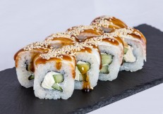 Угорь, королевская креветка, авокадо, сыр, нори,рис, соус унаги, кунжут