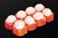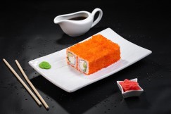 Рис ,нори, лосось , сыр, икра "масаго", зеленый лук, кляр, сухари панко ,острый соус ширирача.