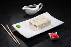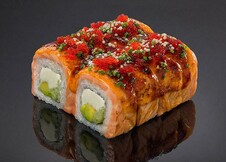 Рис, нори, лосось,сыр, огурец, икра масаго, унаги соус, воздушный рис, микрозелень.